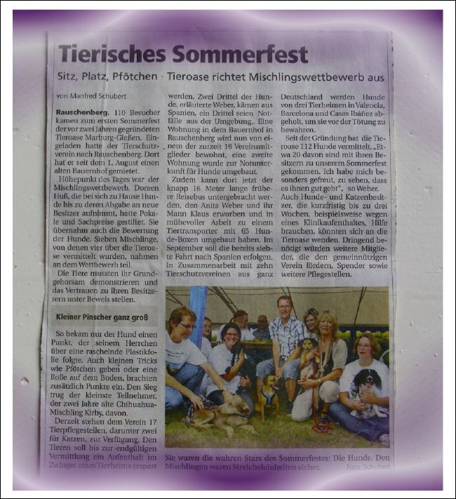Firmenspenden und Sponsoren: Futterhaus Zweibrücken für die vielen Sach- und Futterspenden. Familie Matz für den Rundflug über Marburg, der am 22.8.2010 auf dem Sommerfest verlost wird. Fressnapf Marburg für Einkaufsgutscheine Sparkasse Marburg/Biedenkopf für Geldspende Kaufhaus Ahrens in Marburg für Einkaufsgutscheine Herrn Mink für einen tollen Staubsauger der Firma Ecolab Krombacher Brauerei für Gutscheine Licher Brauerei für T-Shirts Tierbedarf Zooplus für die Sachspenden Charlotte Weygand, Tierschutz mit Herz und Verstand, eine Hundehütte Fam. Kutscher, Schreinerei, für Sachspenden Heike von Dittmann-Radons für die Sachspenden SB-Union Marburg für Sachspenden Metro Giessen-Linden für Sachspenden Reinigungsfirma Gies, Herr Gies für Sach- und Geldspende Die Marburger Freitagszeitung für die tolle und schnelle Unterstützung und ihrem Zeitungsartikel