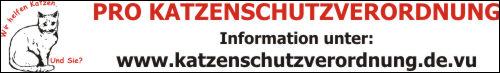 Hier der Link zu dem Presseartikel : Artikel aufrufen http://www.torgauerzeitung.com/NewsDetails.asp?ID=39755kurz registrieren Registrierungslink bestätigen Kurzes Statement als Privatperson oder im Namen eines Tierschutzvereins abgeben Tierfreunde zum Mitmachen animieren Kopie des Statements zur Publikation auf www.katzenschutzverordnung.de.vu bitte an: katzenschutzverordnung@katzenhilfe-westerwald.de Außerdem füge ich Euch das Banner zur Katzenschutzverordnung an.